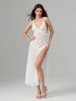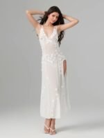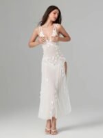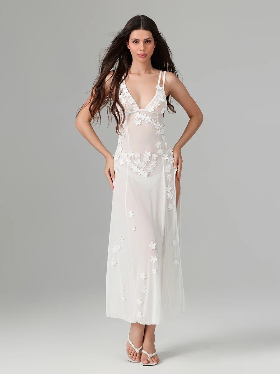 3D Flower Decor Backless Deep V Slit See-Through Beach Dress